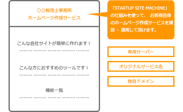 「STARTUP SITE MACHINE」の仕組みを使って、お客様自身のホームページ作成サービスを開設・運用して頂けるプランです。