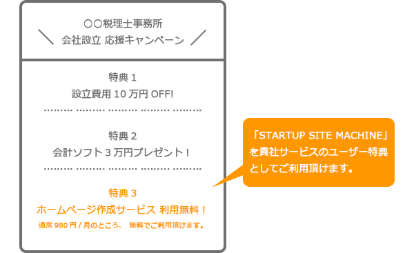 「STARTUP SITE MACHINE」を貴社サービスのユーザー特典として簡単にご利用頂けるプランです。